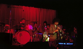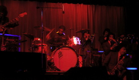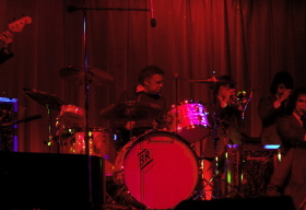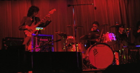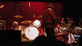 These photographs were taken by me from the second row (an unbelievable vantage point to witness another RIDICULOUS performance!) in the auditorium of Bethesda Chevy Chase High in Maryland on Thursday evening January 24, 1980. This fourth photo is a composite constructed from two photos taken before the gig began. Consequently, it is a pretty nice close-up documentation of Buddy's drums of the time. Please note his "Swish Knocker" cymbal (LOUD mother'), given to him by drummer Mel Lewis, AND the infamous cheesy-sounding Synare electronic drum, which can be heard on the Ronnie Scotts live album of the same period. Also, note the tape on the underside of the ride cymbal.